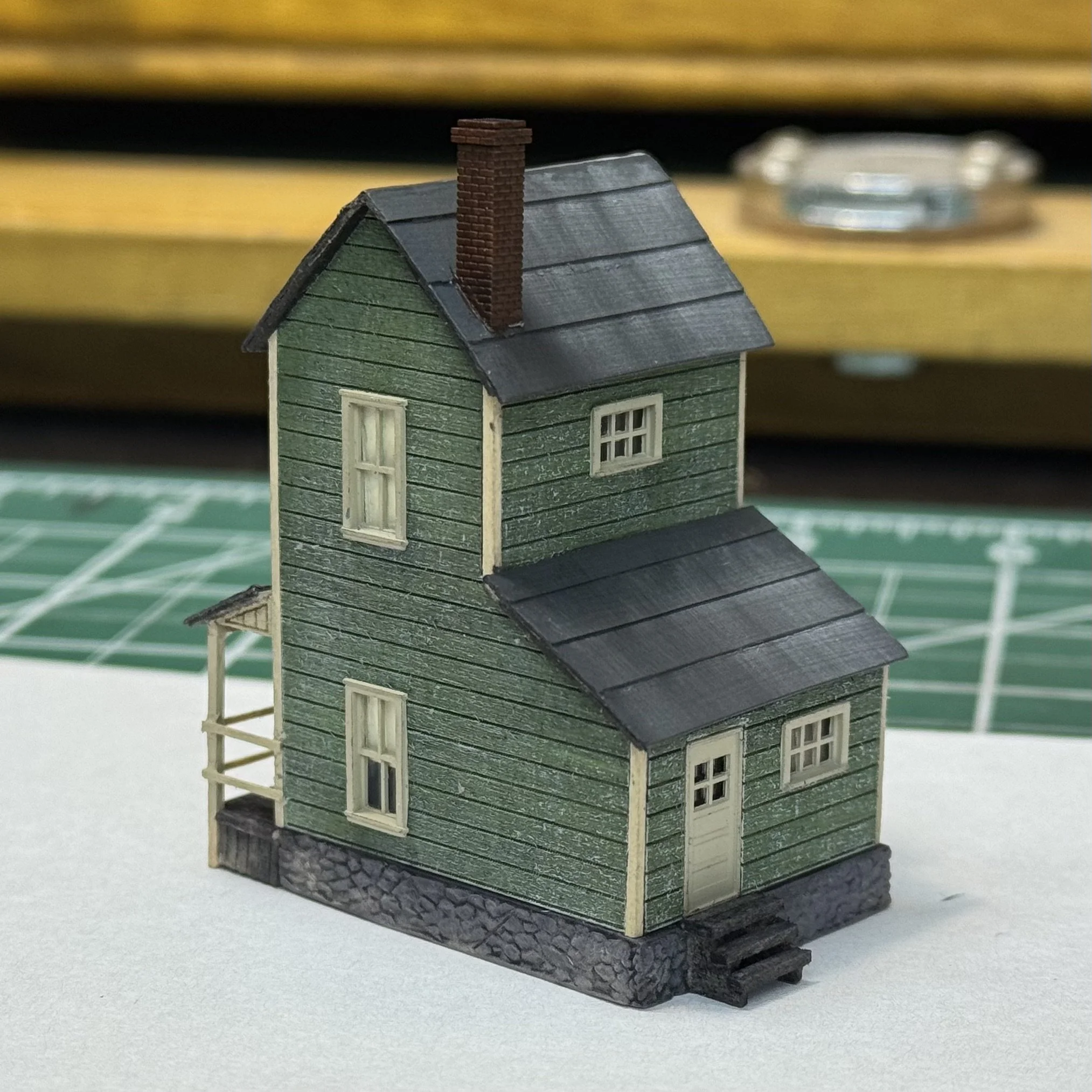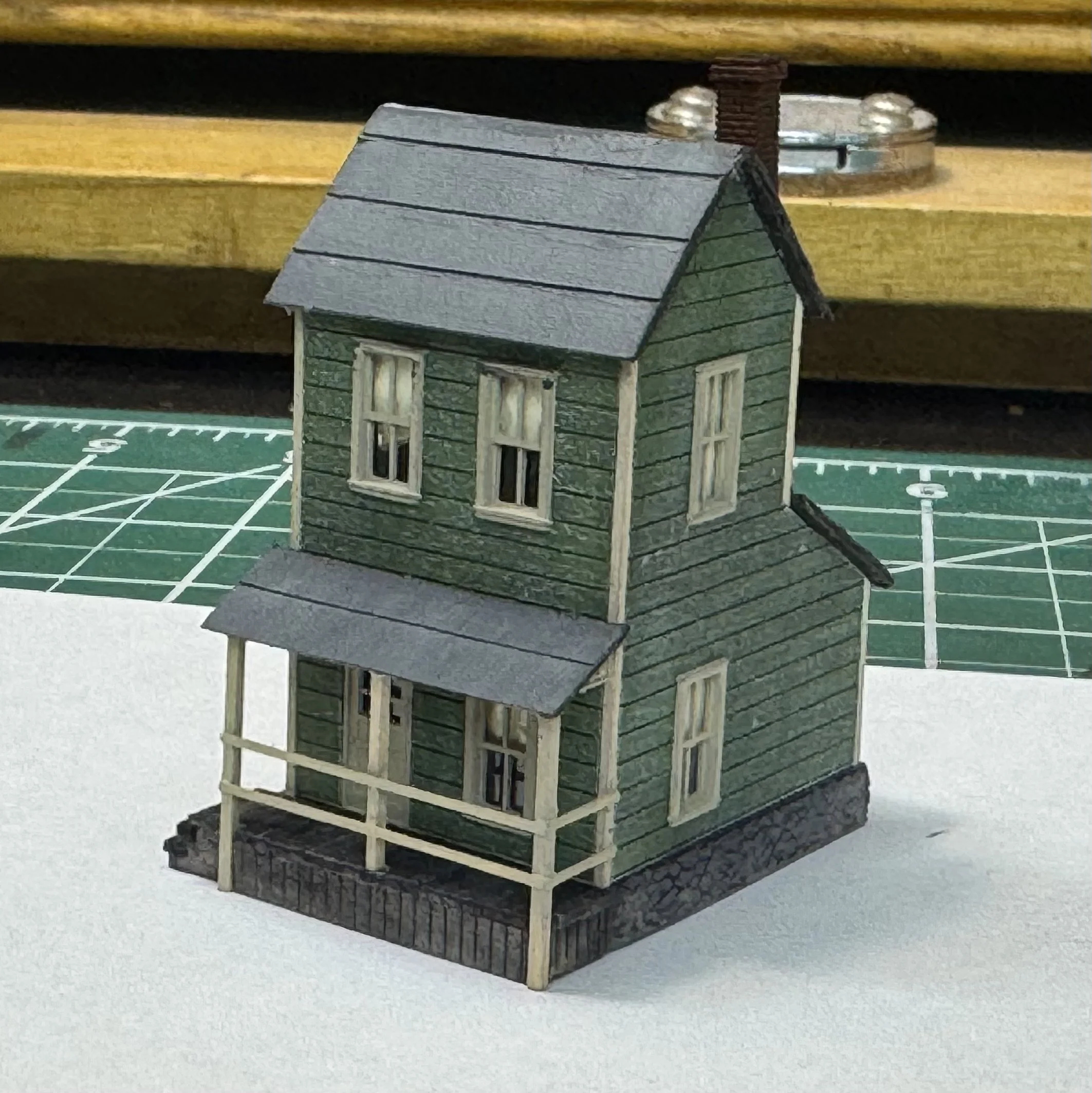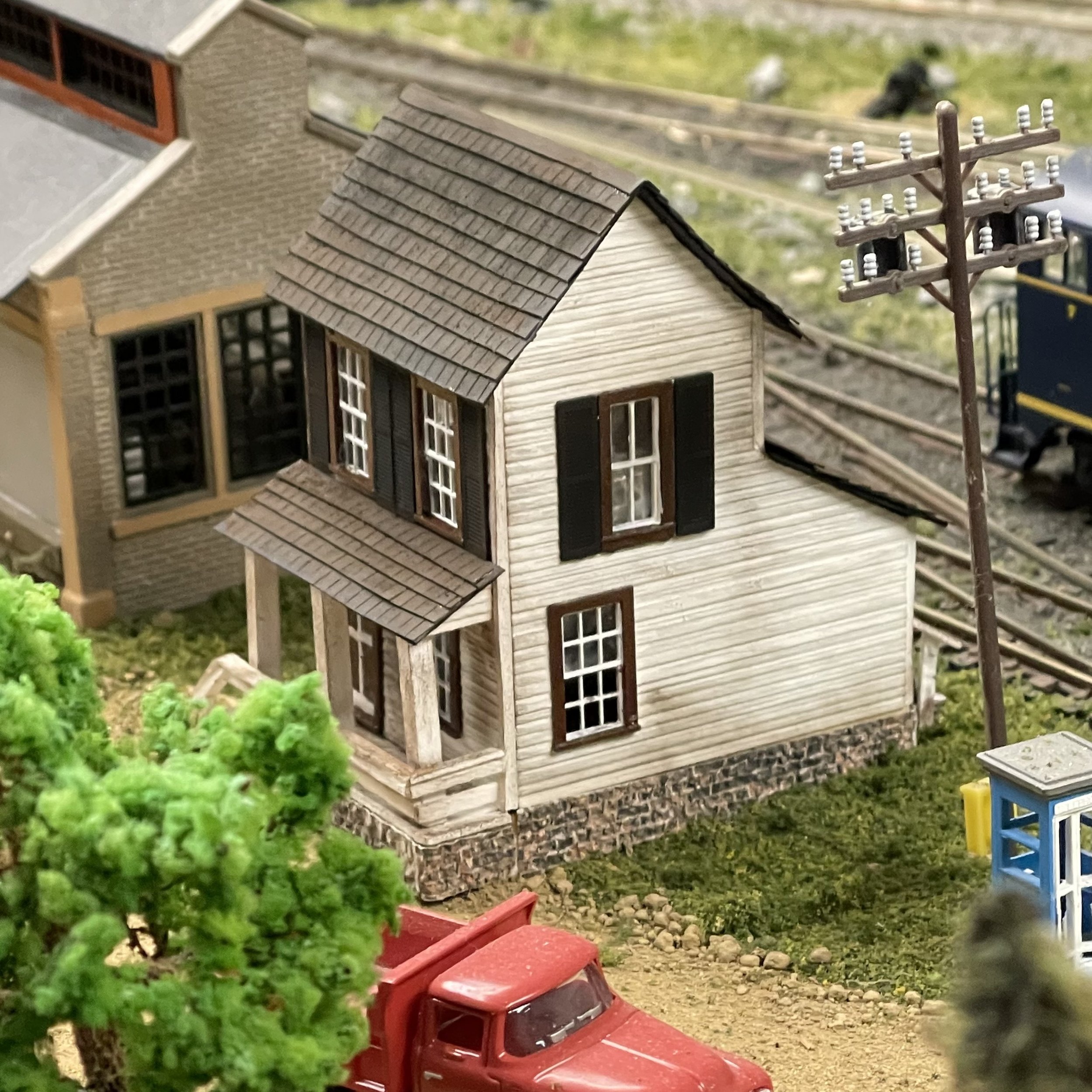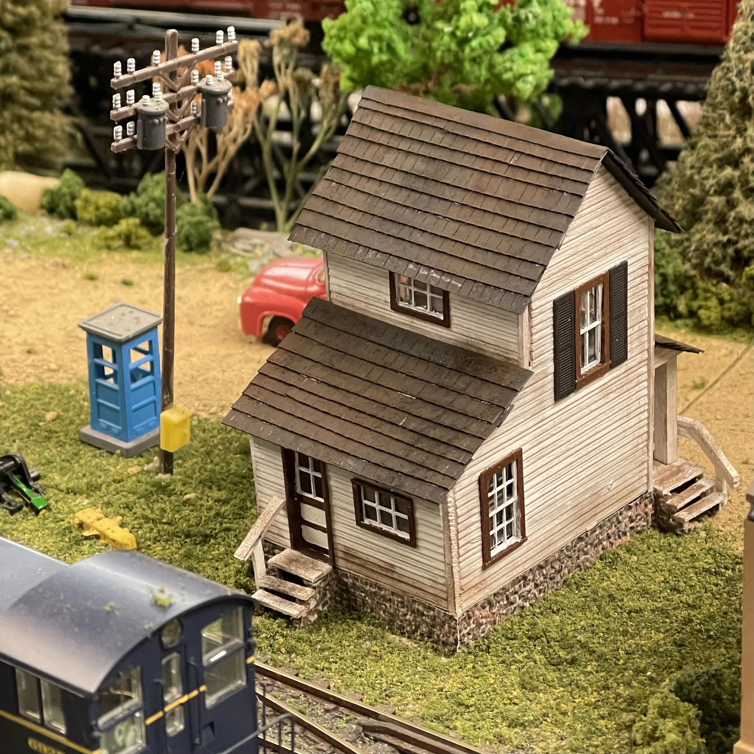 Bill M. and Scott W. unknowingly tackled the same Conowingo Models Grey Street Company House kit at the same time—Bill on the HO version and Scott on the N scale. Bill’s HO build went smoothly: he replaced the provided rolled roofing with individually applied shingles, carefully completed paintwork, subtle weathering that brought out the siding and trim, and clean glazing that made the windows pop. Scott’s N scale version was rewarding: tiny parts required a steady hand and a magnifier, paint was applied with patience, and the final, compact model captured the same character as Bill’s larger house. Both finished with pride and complementary results.